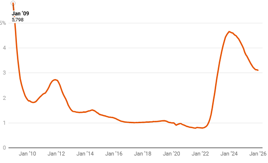 • Rates down from 3.984% (Jan 2025) to 3.111% (Jan 2026): Clear year-on-year easing.